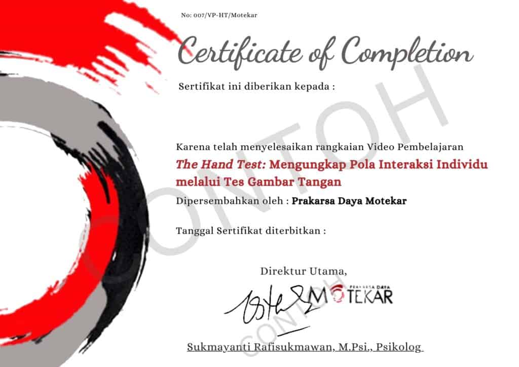 Setelah menyelesaikan program video pembelajaran ini, Anda akan mendapatkan sertifikat resmi dari Prakarsa Daya Motekar sebagai tanda penyelesaian program dan sebagai tanda pemahaman Anda tentang The Hand Test sesuai dengan rangkaian Video Pembelajaran yang Anda pilih.
