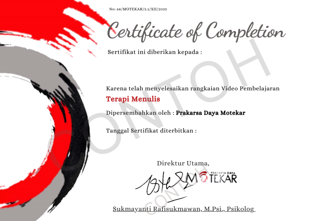 Setelah menyelesaikan program video pembelajaran ini, Anda akan mendapatkan sertifikat resmi dari Prakarsa Daya Motekar sebagai tanda penyelesaian program dan sebagai tanda pemahaman Anda tentang Terapi Menulis sesuai dengan rangkaian Video Pembelajaran yang Anda pilih.